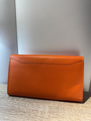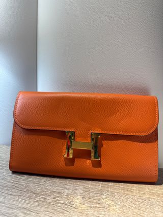 Elegante bolso de la marca Hermès. - Color naranja vibrante. - Detalle metálico dorado en forma de H.