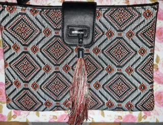 Bolso de mano con un llamativo estampado geométrico. - Diseño con solapa y cierre. - Adornado con un detalle de flecos. - Acabado en tela con detalles en negro.