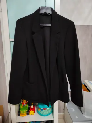 Blazer negro de corte clásico, ideal para añadir un toque sofisticado a cualquier atuendo. - Diseño de solapa. - Dos bolsillos frontales.