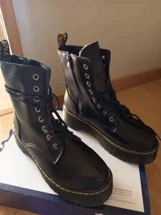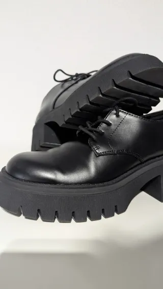 Mocasines de plataforma con cordones. Diseño de suela gruesa y dentada. Acabado liso y brillante. Solo han sido usados dos veces, dan más talla de la que es, como una 38.