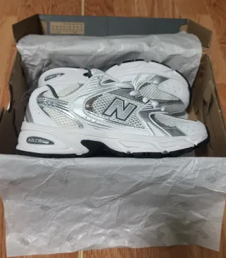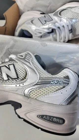 Zapatillas deportivas New Balance 530 en color blanco y plata y con pequeños detalles dorados - Talla 40 = 25cm - Con su caja