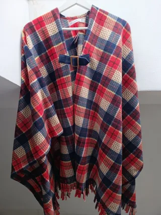 Poncho de cuadros con un diseño moderno y versátil.Pone talla Xs pero es talla única,vale para todas las tallas de la xs-xl - Estampado de cuadros en tonos rojos, azules y beige. - Detalle de hebilla en la parte delantera. - Flecos en el bajo para un toque bohemio.