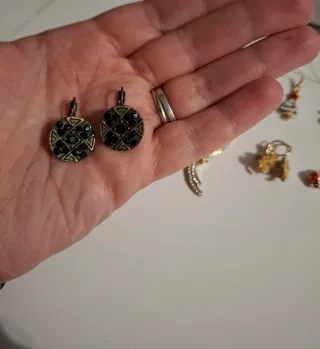 Conjunto de pendientes de diferentes estilos y diseños. - Pendientes con forma de árbol de Navidad. - Pendientes con forma de hoja. - Pendientes con forma de tucán. - Pendientes de aro dorados. - Pendientes pequeños con detalles rojos.