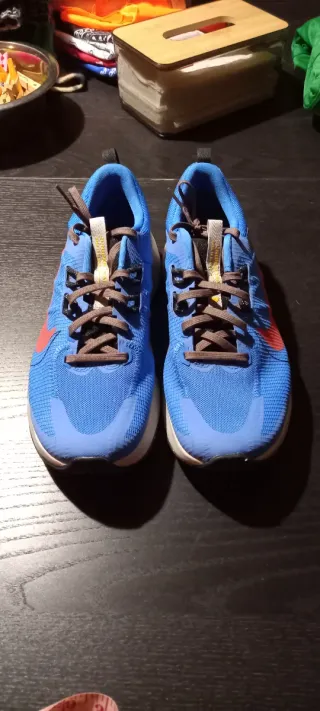 Zapatillas deportivas Nike Juniper Trail en talla 42. Perfectas para senderismo y trail running. - Diseño en color azul con detalles en rojo. - Cierre con cordones. - Suela con buen agarre.
