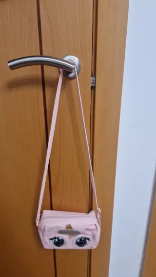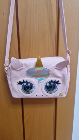Bolso con diseño de unicornio de la marca Pulse Pets. Es un accesorio divertido y llamativo. - Color rosa con detalles dorados. - Forma de unicornio con ojos grandes y cuerno brillante. - Correa ajustable para llevar al hombro. - Con movimiento de ojos y sonidos (pilas incluidas). - Poco uso.