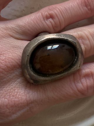 Anillo con una piedra de color verde y montura de plata. - Diseño cuadrado en la piedra. - Montura de plata.
