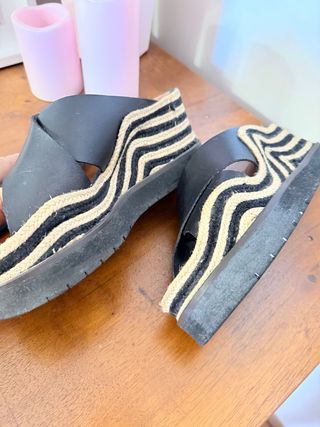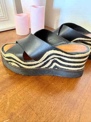 Sandalias de cuña con diseño de rayas. - Tira delantera cruzada. - Plataforma forrada de yute y tela. - Suela de goma.