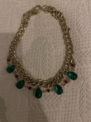 Elegante collar de la marca Pepe Jeans con un diseño llamativo. - Cadena gruesa dorada. - Colgantes en forma de lágrima de color verde esmeralda. - Detalle de pequeñas cuentas rojas.