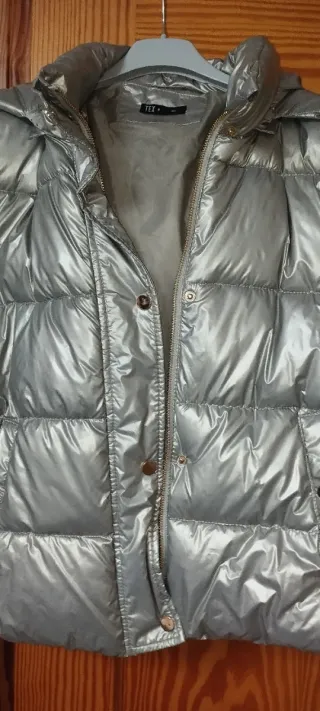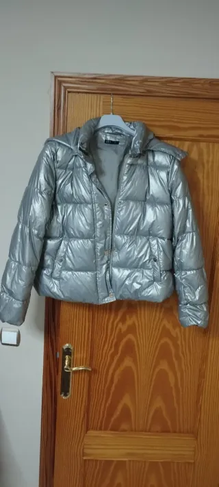 Chaqueta tipo bomber con un acabado brillante. - Diseño acolchado. - Cierre de cremallera. - Cuello con capucha.