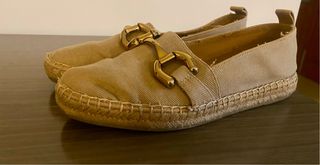 Elegantes zapatos planos de Zara, perfectos para cualquier ocasión. - Diseño tipo mocasín con detalle metálico dorado. - Acabado en tela color beige. - Suela de esparto cosida.