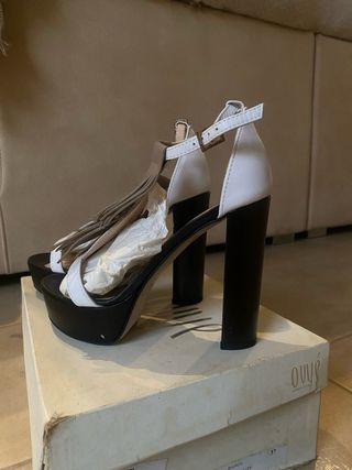 Elegantes zapatos de tacón alto con un diseño único. - Combinación de colores blanco y marrón. - Talla 37. - Detalle de flecos en la parte delantera. - Correa ajustable en el tobillo.