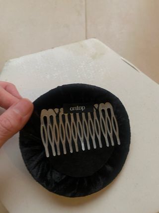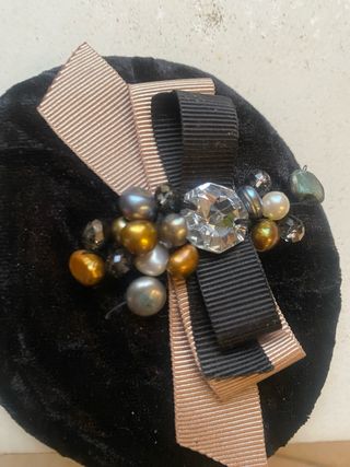 Elegante tocado para el cabello, con una base de terciopelo negro y adornos. - Base de terciopelo suave. - Detalle de lazo en cinta negra y beige. - Adornado con perlas y cristales. - Incluye cuentas en tonos dorados y grises.