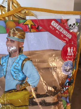 Disfraz de genio de lámpara mágica, inspirado en Aladdín. - Incluye turbante, chaleco y pantalones con lámpara - Detalles dorados y azules -No incluye cubre zapatos