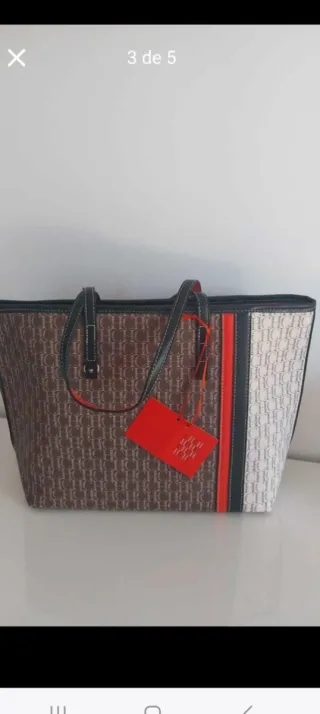 Elegante bolso con monograma CH. - Diseño bicolor en marrón y blanco. - Detalles en rojo y negro. - Incluye etiqueta de la marca.