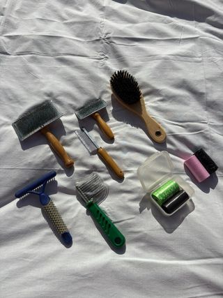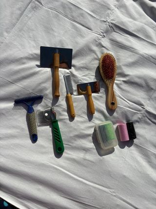 Conjunto de herramientas para el cuidado de mascotas. - Cepillo de púas metálicas. - Peine de dientes finos. - Cepillo de pala con mango de madera. - Cepillo de cerdas con mango de madera. - Rastrillo para pelo. - Cepillo con mango verde y protector. - Contenedor con accesorios. - Rollos de hilo o similar.