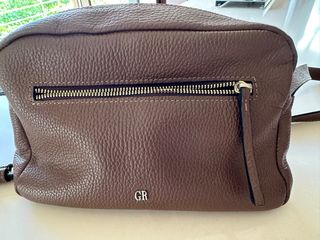 Bolso de piel con un diseño moderno y elegante. Su textura granulada le da un toque sofisticado. - Cierre principal con cremallera. - Bolsillo exterior con cremallera. - Detalle de iniciales metálicas 'GR' en la parte frontal.