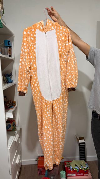 Disfraz de Bambi con un diseño adorable y divertido. - Estampado de lunares blancos sobre fondo naranja. - Capucha con detalles de ciervo. - Cierre de cremallera frontal.