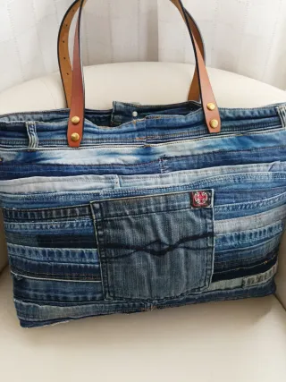 Bolsa tote bag de tela de jeans. Forrada, entretelada con tejido semi rígido y con asas de cuero. Tiene un bolsillo externo y otro interno. Mide: 31 x 9 x 45. Original, útil, cómoda y única. No puedo rebajar el precio por los materiales y las horas dedicadas.
