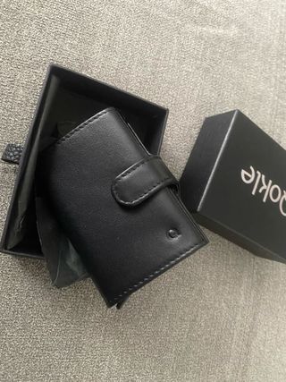 Cartera elegante de cuero. - Diseño compacto y moderno. - Cierre de botón a presión. - Compartimento para tarjetas. Esta cartera de cuero negro marca Dokle es un tarjetero compacto con bloqueo RFID y caja de aluminio automática para tarjetas