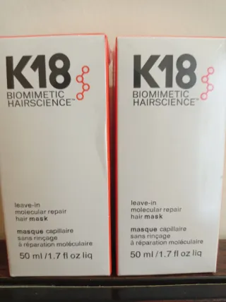 Se venden dos mascarillas K18 Biomimetic Hairscience, ambas auténticas y precintadas en su plástico original. - Mascarilla molecular para reparación capilar. - Formato leave-in (sin aclarado). - Contenido: 50 ml / 1.7 fl oz liq cada una.