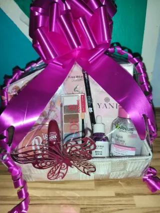 Preciosa cesta de regalo llena de artículos de belleza y un peluche. - Peluche de conejo rosa. - Taza con diseño Te Quiero. - Set de brochas de maquillaje. - Paleta de sombras y colorete All in One. - Brillo de labios. - set de 24 uñas postizas. - mascarilla facial Yara. - colonia Yani. 90ml. - polvos translúcidos minerales. - polvos compactos bronceador. - primer preparador del maquillaje. - iluminador - duo mejillas y labios. - gloss transparente hidratante. - crema para los ojos. Se entrega o envía envuelto para regalo con plástico trasparente y lazo Se puede ver esta o más cestas en tiktok Decoracionesrocio Ideal para regalo