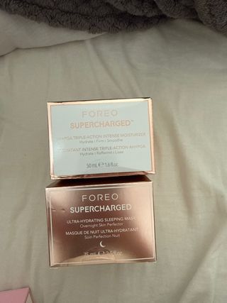 Set de dos productos de la línea Supercharged de Foreo. - Crema hidratante intensa triple acción. - Mascarilla de noche ultra-hidratante. - Incluye crema de 50 ml y mascarilla de 75 ml.