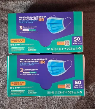 Dos cajas de mascarillas quirúrgicas de un solo uso. - Modelo: Mascarilla Quirúrgica No Reutilizable IIR. - Protección: 3 capas, BFE ≥ 98%. - Certificación: EN 14683:2019 + AC: 2019, Tipo IIR. - Incluye 100 unidades.
