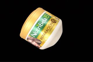 Mascarilla capilar NutriBela para reparación intensiva. - Tarro con tapa dorada. - Etiqueta con imagen de mujer y detalles dorados.