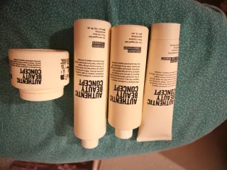 Set de productos para el cuidado del cabello de Authentic Beauty Concept. - Incluye limpiador champu(cleanser), acondicionador (conditioner) y tratamiento para puntas (split end remedy). - Formatos de 300 ml, 250 ml y 15 fl. oz. - Diseñados para cabello dañado y sensible.