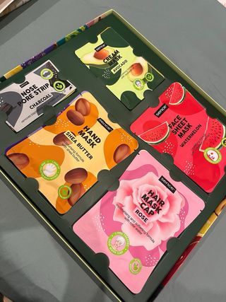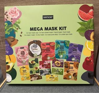 Kit de mascarillas Sence con varios tratamientos. - 2x mascarilla capilar (rosa y coco). - 2x mascarilla facial (sandía y algas). - 1x mascarilla de pies (lavanda). - 2x mascarilla de crema (piña y aguacate). - 2x tiras para poros (carbón y árbol de té). - 1x mascarilla de manos (manteca de karité). - 2x mascarilla de ojos (limón).