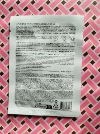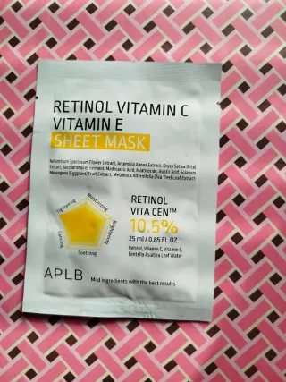 Mascarilla facial APLB con Retinol, Vitamina C y Vitamina E. Contiene 25 ml / 0.85 FL.OZ. de producto. - Retinol, Vitamina C, Vitamina E, Agua de Hoja de Centella Asiática. - Ingredientes suaves con los mejores resultados. - Beneficios: Reafirmante, Hidratante, Iluminador, Calmante y Suavizante. - Cosmética coreana k-beauty