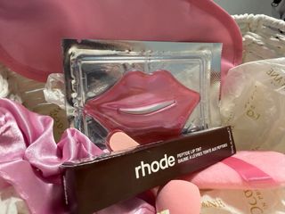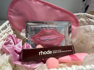 Set de cuidado labial que incluye un bálsamo tintado y una mascarilla. - Bálsamo labial Rhode Peptide Lip Tint. - Mascarilla para labios con forma de labios. - Incluye scrunchie rosa y esponjas de maquillaje. - Antifaz rosa