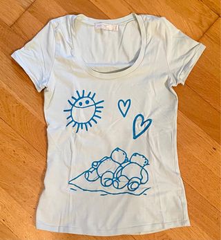 Camiseta ajustada de manga corta con un divertido estampado. - Dibujo de un sol con mascarilla. - Dos ositos tumbados. - Dos corazones. - Cuello redondo.