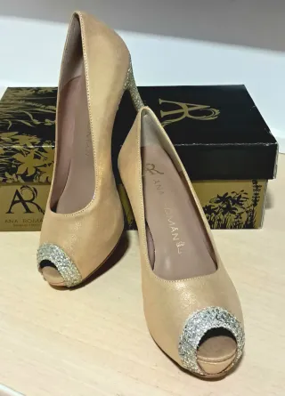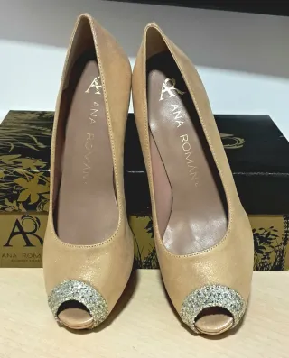 Elegantes zapatos de tacón con plataforma en color camel y detalles de pedrería en la puntera y el tacón. La marca Ana Roman es sinónimo de calidad y diseño. - Acabado con brillo sutil. - Diseño peep-toe. - Adorno de pedrería plateada. - Piel natural. - Hecho en España. - Precio en tienda 87 €. También tengo la talla 37, oferta, liquidación.
