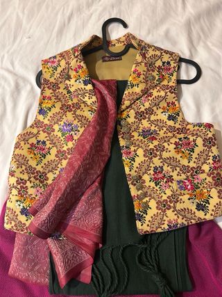 Conjunto de traje tradicional Saraguell para niño, talla 11 aproximada. Incluye chaleco, pañuelo y pantalón. - Chaleco con estampado floral multicolor sobre fondo amarillo. - Cierre de botones dorados en el chaleco. - Pañuelo a juego con estampado. - Faja verde oscuro - Negrilla fucsia