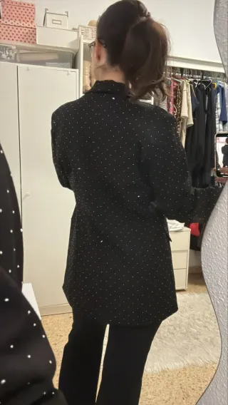 Elegante blazer negro adornado con pedrería. Está como nuevo. Si eres M te queda algo oversize. - Diseño con estampado de pequeños puntos brillantes. - Corte moderno y sofisticado. - Ideal para ocasiones especiales o para elevar un look casual.