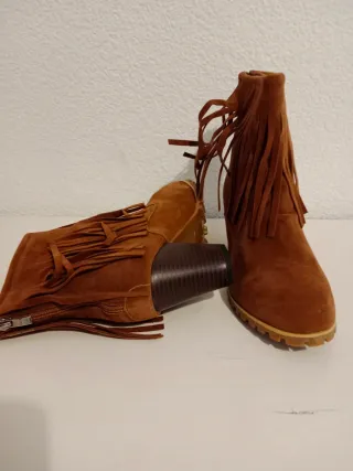 Botines de estilo boho con flecos, perfectos para añadir un toque único a tu look. - Material: Ante sintético. - Cierre de cremallera en la parte trasera. - Detalle de flecos decorativos. - Tacón grueso.