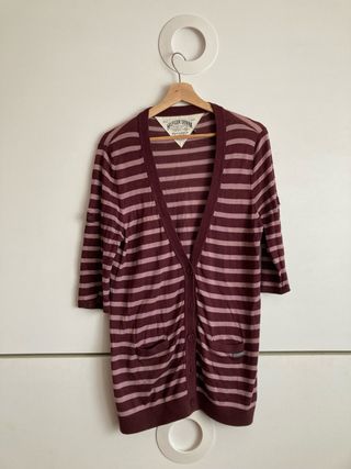 Chaqueta de punto con un diseño de rayas en tonos burdeos y rosas. Es una prenda cómoda y versátil. Largo de mangas regulable con botón. - Diseño de rayas horizontales. - Cuello en V. - Cierre de botones. - Dos bolsillos delanteros.