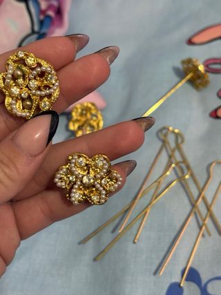 Elegante aderezo con un diseño intrincado. - Detalles en perlas y cristales. - Acabado en tono dorado. - agujas para el pelo y rodetes