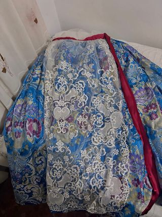 Auténtico traje tradicional para lucir en las Fallas. Un diseño vibrante y lleno de detalles. - Tejido con estampado floral. - Ribetes y encajes decorativos. - Cintas rojas para ajuste.