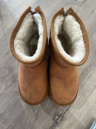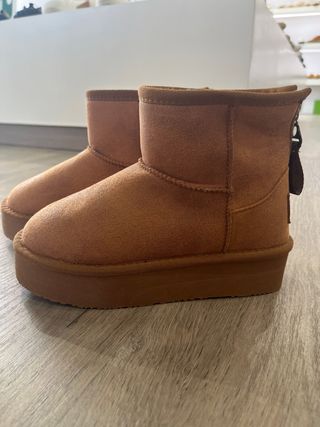 Botas tipo australianas en talla 34. Son cómodas y cálidas, perfectas para el frío. - Detalle de lazo en la parte trasera. - Forro interior de pelo sintético. - Suela gruesa y resistente.