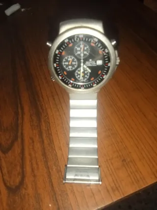 Elegante reloj Blumar con diseño cronógrafo. - Esfera negra con detalles plateados. - Correa de metal plateado. - Bisel con marcadores.