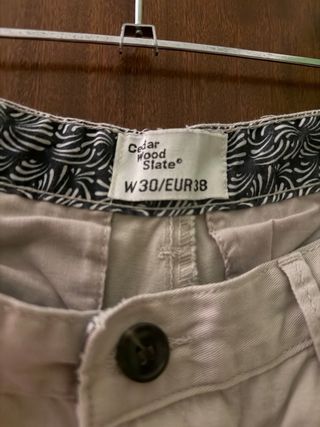 Pantalón corto de tela con un diseño clásico. - Cintura con trabillas para cinturón. - Cierre de botón y cremallera. - Bolsillos delanteros y traseros.