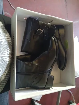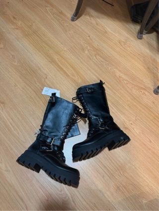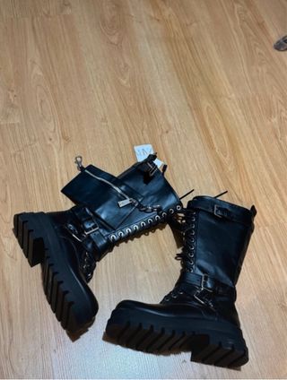 Botas altas de estilo moderno con detalles de cordones y hebillas. - Diseño acordonado. - Bolsillo lateral. - Cierre con hebillas.