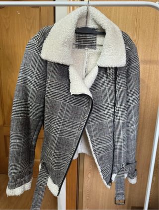 Chaqueta estilo biker con un diseño de cuadros y forro interior de pelo. - Cuello con solapas de pelo. - Cierre cruzado asimétrico. - Cinturón ajustable en la parte inferior. - Puños con detalle de pelo. Muy buen estado sin usar Es talla única, pero talla una S/M