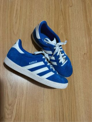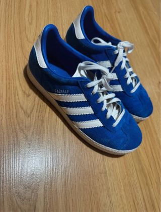 Zapatillas Adidas Gazelle de ante azul con detalles en blanco. Un clásico versátil. - Diseño icónico de tres rayas. - Detalle Gazelle en el lateral. - Suela de goma blanca. Usadas dos veces, en perfecto estado