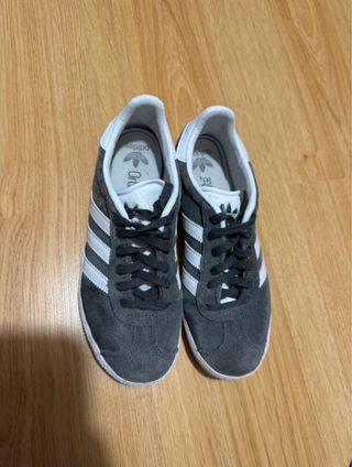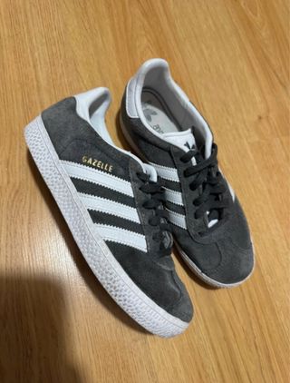 Zapatillas Adidas Gazelle en color gris oscuro. Un clásico versátil para el día a día. - Diseño unisex. - Tres rayas blancas características de Adidas. - Detalle Gazelle en dorado.