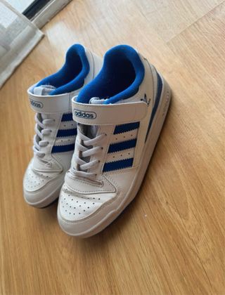 Zapatillas deportivas Adidas Forum Low en blanco y azul. - Cierre de velcro y cordones. - Detalle de las tres rayas. - Diseño clásico.