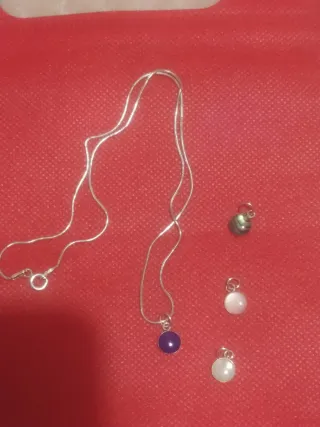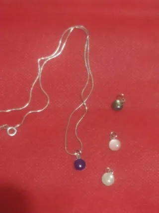 Elegante cadena de plata con un colgante de piedra azul . Incluye tres colgantes adicionales intercambiables. - Cadena de plata. - Colgante principal de piedra azul - Tres colgantes adicionales: uno verde y dos blanco y rosa .