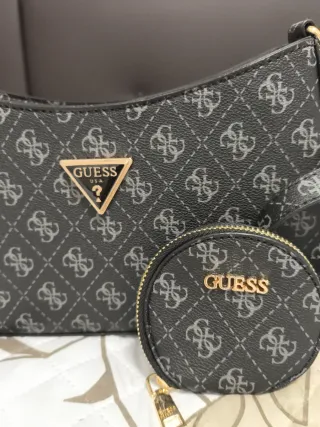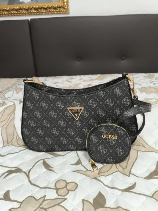 Bolso de hombro Guess con un diseño de monograma en tonos negros y grises. Incluye un pequeño monedero a juego. - Diseño de monograma. - Incluye monedero. - Cierre de cremallera. Tiene un defecto atrás,una pequeña raja gue no se nota